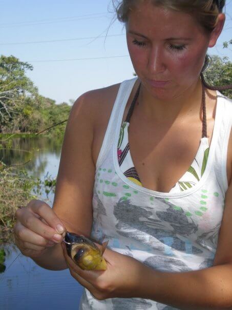 Eén van de hoogtepunten van de tour vond ik het piranha-vissen. De gids zette ons met z’n tweeën af bij een watertje. We kregen een simpele bamboe hengel en een bakje met stukjes koeienhart. We moesten het aas (een stukje hart dus) aan het haakje prikken en hengelen maar! Aangezien de gids er vandoor ging en ons na een andere tour zou komen oppikken, gingen we ervan uit dat we niets zouden vangen. Want wat moesten we doen als we écht een piranha zouden vangen!? Maar na een paar minuten was het al raak en had ik de eerste piranha gevangen!! Tja… toen kwam mijn zeer bescheiden viservaring in Friesland toch wel van pas: visje goed vastpakken en héél voorzichtig het haakje loshalen. Wat een tanden hebben die beesten!